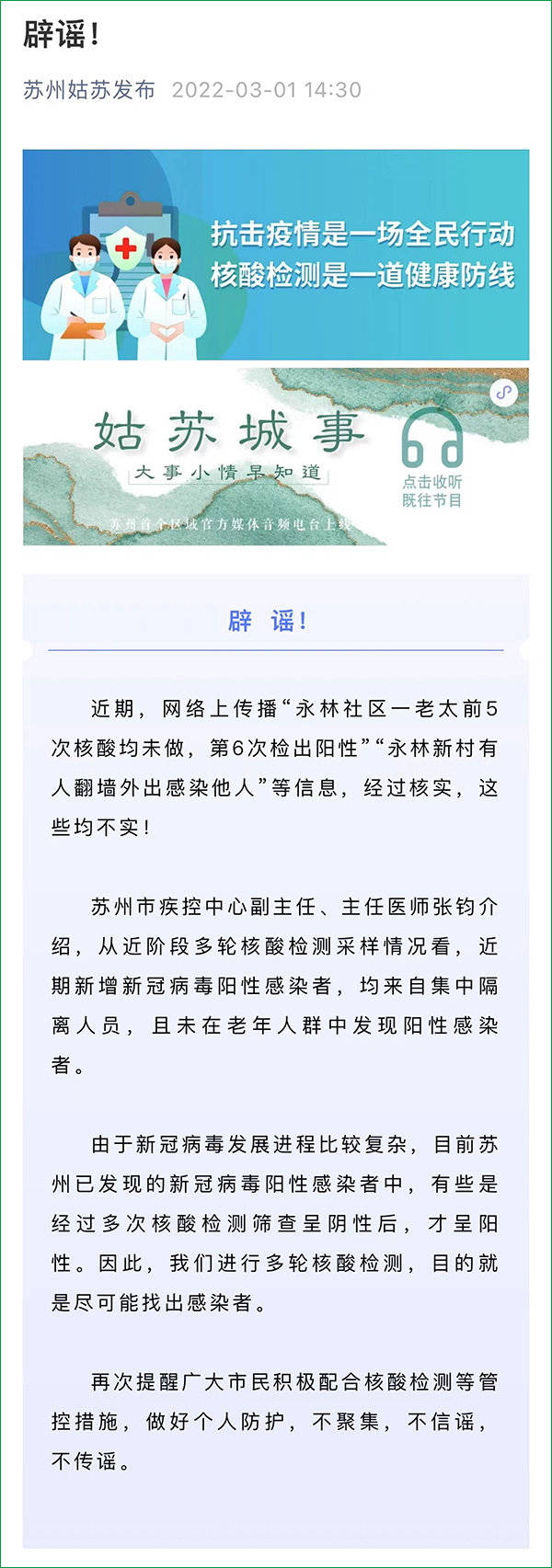 #聯(lián)合辟謠##微博辟謠#【蘇州一社區(qū)老太第6次核酸檢出陽性?蘇州某新村有人翻墻外出感染他人?都是謠言!】近期,網(wǎng)傳蘇州“永林社區(qū)一老太前5次核酸均未做,第6次檢出陽性”“永林新村有人翻墻外出感染他人”等信息。經(jīng)核實,這些均系不實內容!據(jù)蘇州市疾控中心副主任、主任醫(yī)師張鈞介紹,從近階段多輪核酸檢測采樣情況看,近期新增新冠病毒陽性感染者均來自集中隔離人員,且未在老年人群中發(fā)現(xiàn)陽性感染者。由于新冠病毒發(fā)展進程比較復雜,目前蘇州已發(fā)現(xiàn)的新冠病毒陽性感染者中,有些是經(jīng)過多次核酸檢測篩查呈陰性后才呈陽性。因此,蘇州進行多輪核酸檢測,目的就是盡可能找出感染者。提醒廣大市民在積極配合核酸檢測等管控措施時,不造謠、不信謠、不傳謠。@蘇州姑蘇發(fā)布