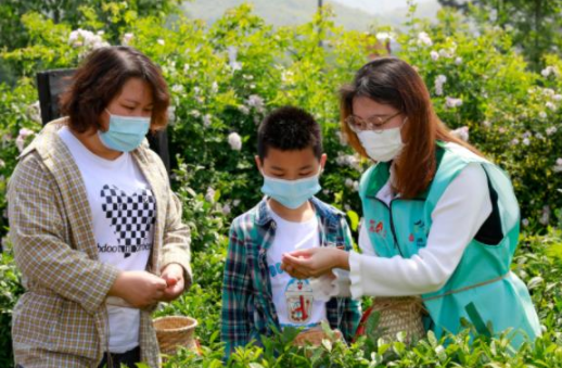 南京江寧區(qū)黃龍峴景區(qū)游客正在志愿者的帶領(lǐng)下采茶