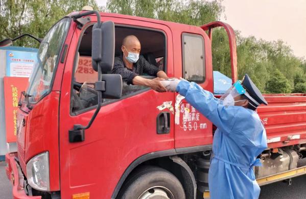 溧蕪高速高淳出口來寧查驗服務點,高淳區(qū)交通運輸局執(zhí)法人員為貨車司機送上愛心物資。通訊員 宋端平 南京日報/紫金山新聞記者 徐琦 攝