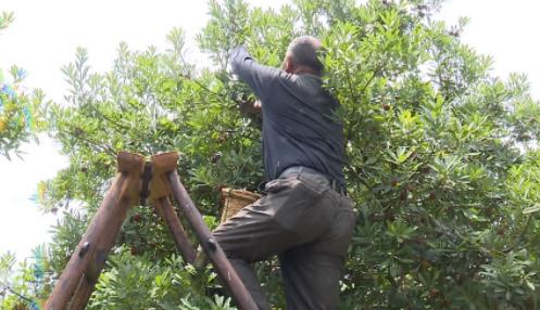 記者在東山鎮(zhèn)楊灣村的山上果園看到,楊梅樹果實累累,果農(nóng)正在梯子上采摘。