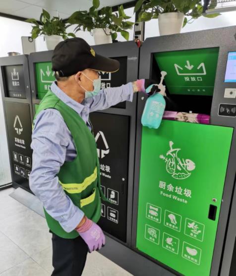 組織督導(dǎo)員、志愿者每日定時(shí)針對(duì)小區(qū)內(nèi)環(huán)保屋、垃圾亭的設(shè)施、垃圾桶進(jìn)行日常保潔消殺工作。集中消毒清洗,利用消毒液無(wú)死角全覆蓋噴灑清洗垃圾桶。