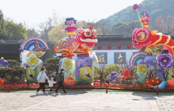 1月12日,游客從惠山古鎮(zhèn)新春景觀前經(jīng)過(guò)。春節(jié)臨近,錫城街頭張燈結(jié)彩,年味漸濃,人們以各種形式喜迎佳節(jié)。(宦瑋 攝)