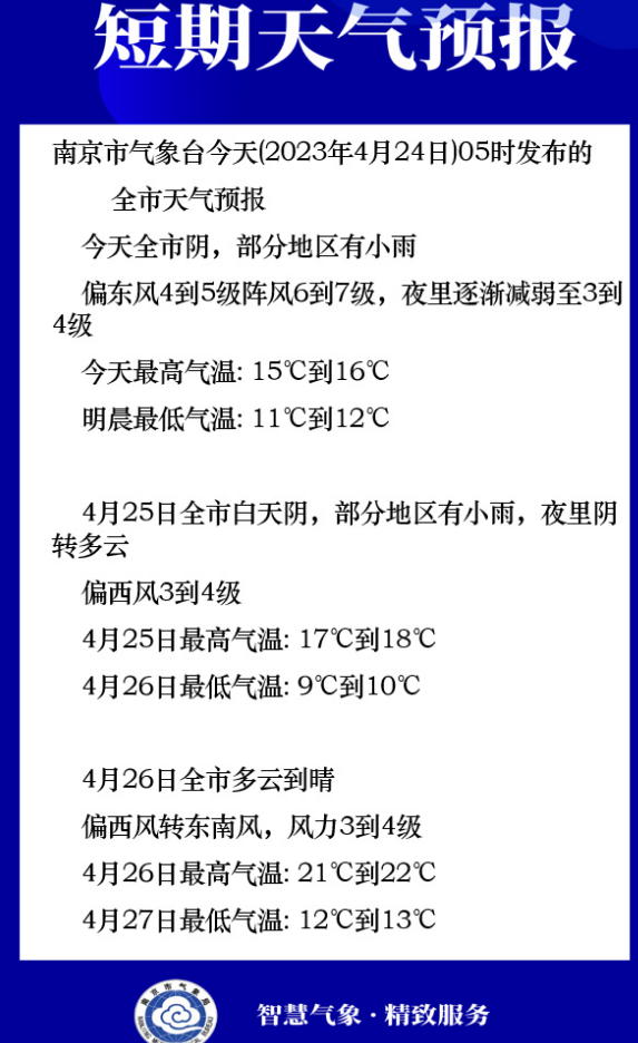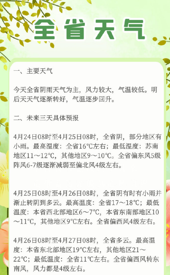 4月24日8時(shí)至4月25日8時(shí),全省陰,部分地區(qū)有小雨。最高溫度:全省16℃左右;最低溫度:蘇南地區(qū)11~12℃,其他地區(qū)9~10℃。全省偏東風(fēng)5級(jí)陣風(fēng)6-7級(jí)逐漸減弱至偏北風(fēng)4級(jí)左右。