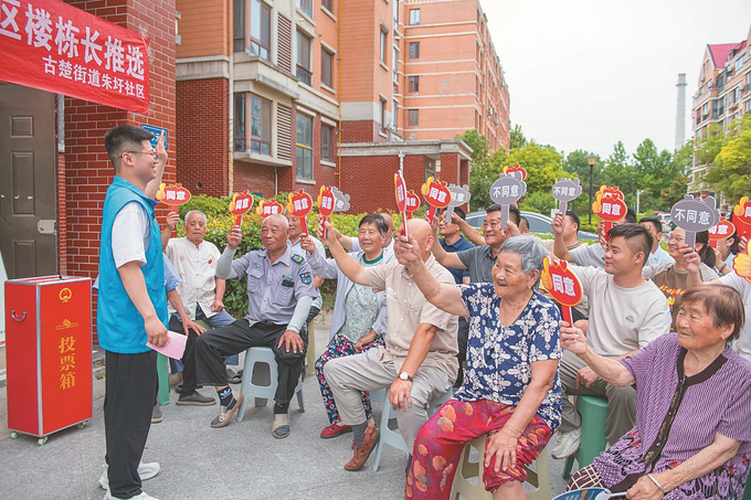 6月18日,宿遷經(jīng)濟(jì)技術(shù)開發(fā)區(qū)古楚街道朱圩社區(qū)古楚公寓小區(qū)開展“民主議事會(huì)”,居民當(dāng)“考官”,現(xiàn)場(chǎng)票選樓棟長(zhǎng)。徐江海 攝 (視覺江蘇網(wǎng)供圖)