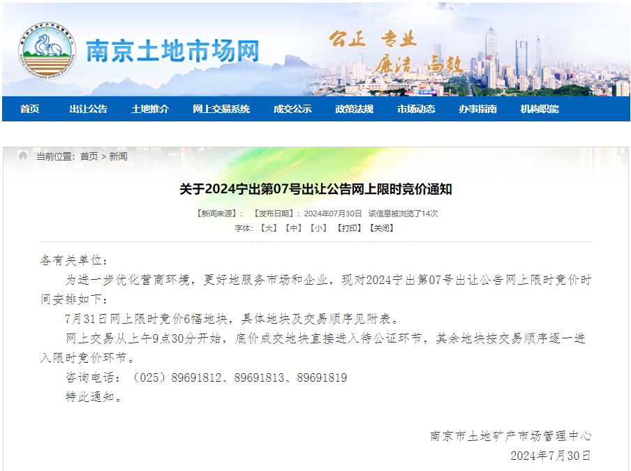 7月30日,南京土地市場網(wǎng)發(fā)布“關(guān)于2024寧出第07號出讓公告網(wǎng)上限時競價通知”,于明天出讓的6幅住宅用地競價順序出爐。