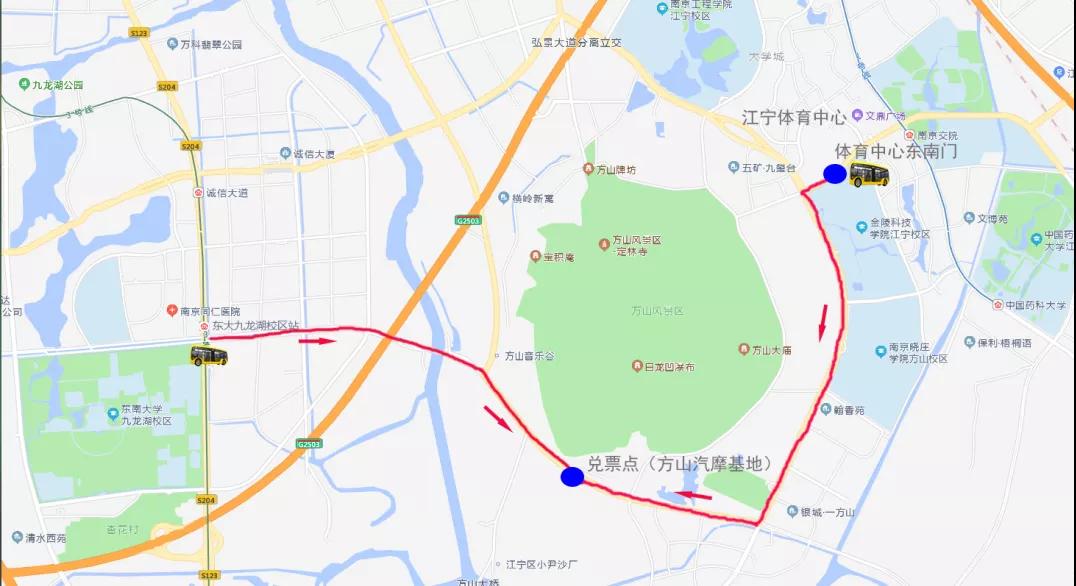 地鐵1號線南京交院站2號口出站,沿格致路步行800米前往江寧體育中心東南門乘坐官方免費(fèi)接駁車抵達(dá)兌票點(diǎn)(方山汽摩基地)。