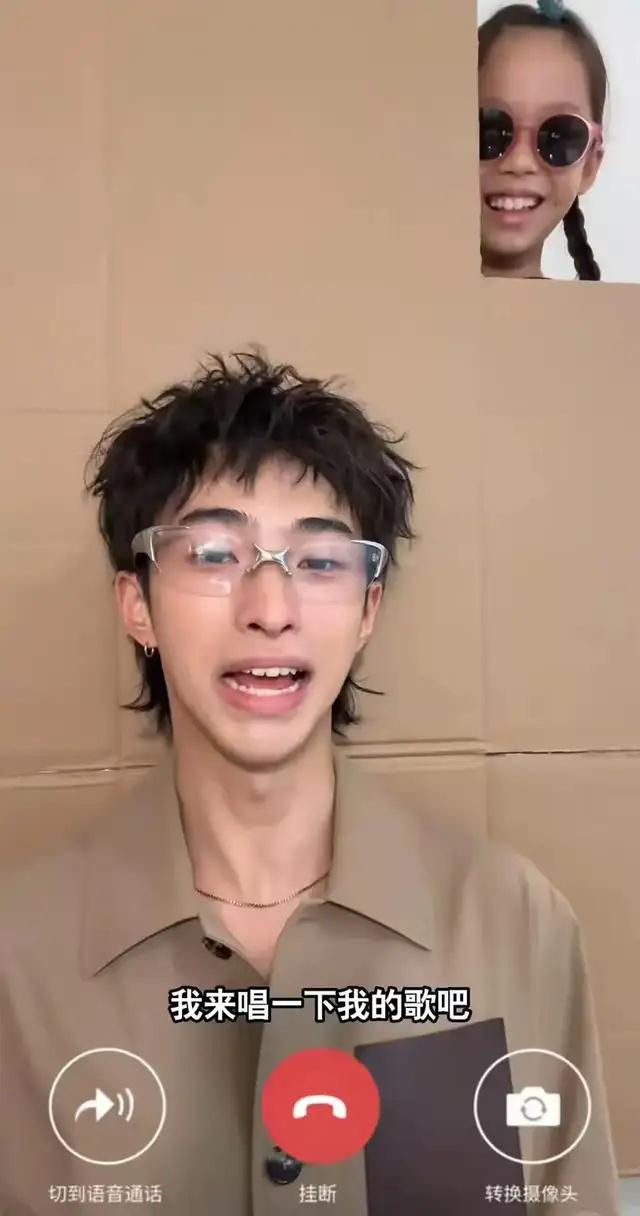 只見(jiàn)在恩利的視頻中,兄妹倆宣傳整活,拿著一個(gè)紙板子假裝視頻聊天。恩利戴著眼鏡打扮很青春少年,穿著卡其色的睡衣正襟危坐邀請(qǐng)自己的妹妹米粒上線,而9歲的米粒梳著拳擊辮戴著搞怪的墨鏡,在鏡頭前表演型人格拉滿,兄妹倆打歌演出小品既視感。