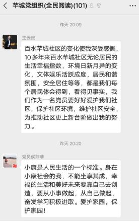 作為土生土長(zhǎng)的馬群人和百水芊城社區(qū)的居民,主講人張竹結(jié)合自己的親身感受,聲情并茂地講述了百水芊城居民自拆遷入住新房后向小康之路邁進(jìn)的一系列動(dòng)人故事,回溯歷史變遷、闡述發(fā)展新貌,短短二十年間,從草房、平房到樓房,從步行到汽車代步、便捷的公共交通,從單一種類到豐富多樣的食物內(nèi)容,從“老、破、小”的城中村到紫東建設(shè)高地,對(duì)于馬群人來說,小康的意義正內(nèi)化于這一粥一飯、半絲半縷之間,滲透到我們生活的方方面面。社區(qū)黨員群眾聽完宣講內(nèi)容后也深有感觸,紛紛講述自己眼中的小康生活和對(duì)全面建成小康社會(huì)的美好展望,青年人也更是深刻地認(rèn)識(shí)到全面建成小康社會(huì)所應(yīng)肩負(fù)的重任。