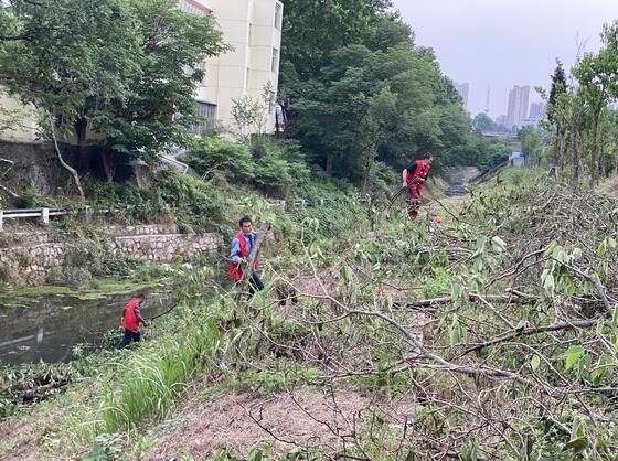 防汛防臺,摟樹葉,亮黨旗,受大風暴雨影響,轄區(qū)內(nèi)濱江河段兩岸樹木大量樹枝被風折斷,落入河道,影響了河道整體環(huán)境,同時也存在一定的安全隱患等問題。為確保河道排水暢通,新合村第一時間全面調動河道工作人員、黨員志愿者,大家分組、分段,充分發(fā)揚“不怕臟、不怕累”的精神,在烈日下毫無怨言地工作,對濱江河工農(nóng)聯(lián)盟河段沿線進行集中清理,全力打撈樹枝、枯枝殘葉,清掃護坡垃圾,盡最大努力減輕暴雨天的危害。