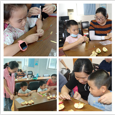 活動(dòng)開始之前,社區(qū)巾幗志愿者將大家?guī)淼奶O果逐個(gè)切片作為實(shí)驗(yàn)材料。在等待活動(dòng)開始的同時(shí),志愿者們還為每位孩子準(zhǔn)備了可愛的竹蜻蜓,鼓勵(lì)小朋友們認(rèn)真聽講,積極參與。