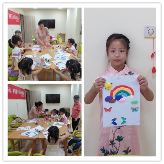 活動中,由于針對的是不同年齡的孩子們,因此志愿者在進行溝通交流的基礎(chǔ)上不局限于教材,跳出了英文課程的限制,全程英語教學(xué),通過結(jié)合社區(qū)現(xiàn)有的手工、書籍類的道具器材寓教于樂,在玩的過程中教會孩子們一些相關(guān)的英語術(shù)語,鼓勵少兒積極展示所學(xué)的英語口語,‘Hello,boys and girls,Good morning!’…幾句開場對白之后,“英語小實驗”正式開始。英語老師和孩子們一起開展彩泥、彩繪加水彩變色小實驗,并進行互動問答。‘What colors do you see?’‘Green,red,black and yellow.’‘Do you like caterpillar?’‘I do like caterpillar because it’令人驚喜的是,孩子們不僅踴躍發(fā)言,甚至有幾個孩子說的非常好,顯然接受過良好的英語啟蒙。隨后的交流環(huán)節(jié),老師鼓勵孩子們用英語介紹自己家庭成員、平時喜歡的小動物、玩具等內(nèi)容‘This is a box,and that is a cat.’‘I made a candy and a butterfly.’稚嫩的童聲說起英語來,尤其悅耳。孩子們最后一起分享了最喜歡的一首英文兒歌,在愉快的歌聲中結(jié)束了本次英語角活動。