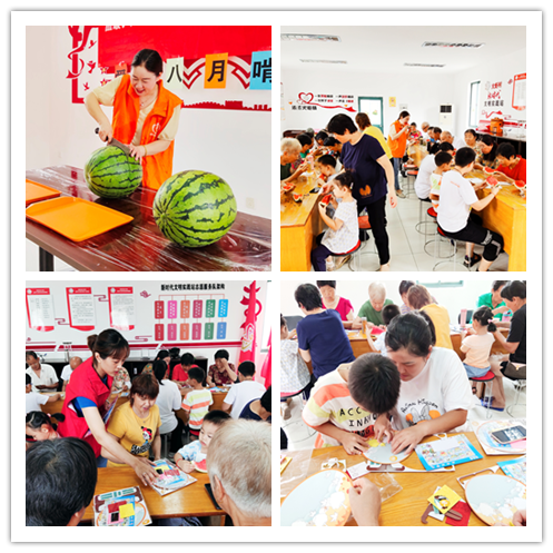活動現(xiàn)場,工作人員為大家分享了立秋的文化習俗,還準備了又圓又大的西瓜,并貼心地為大家切好,大家吃著甜甜的西瓜,有說有笑的相互交流著。吃完西瓜,工作人員還準備了立秋手工制作材料,老少齊上陣,共同把一幅幅精美的作品完成啦。