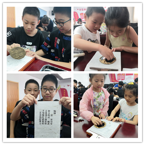 活動(dòng)在學(xué)習(xí)兒童禮儀知識(shí)中拉開(kāi)了序幕,志愿者老師為孩子們講授活字印刷術(shù)的文明歷史及發(fā)明歷程,讓孩子們對(duì)活字印刷術(shù)有基本了解。接著講解活字印刷術(shù)的制作過(guò)程,現(xiàn)場(chǎng)提問(wèn)聲此起彼伏,對(duì)接下來(lái)的操作環(huán)節(jié)充滿了期待。在老師的指導(dǎo)下,孩子們用手中的工具開(kāi)始制作,首先制成單字的陽(yáng)文反文字模,然后按照自己需要的語(yǔ)句或文章把單字挑選出來(lái),排列在字盤(pán)內(nèi),涂墨印刷。印完后再將字模拆出,留待下次排印時(shí)再次使用。一筆一墨一丹青,一紙一字一發(fā)明,看到自己親手制作的一首首古詩(shī)詞成品躍然紙上,孩子們露出滿意的笑容,迫不及待與朋友、家人分享。