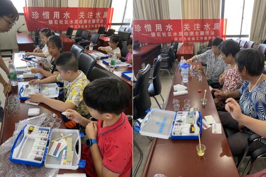 活動伊始,社區(qū)工作人員通過圖文并茂的方式給居民及兒童講解了飲用水的分類、飲用水污染對健康的危害、自來水的來源、衛(wèi)生部門有哪些法律法規(guī)對飲用水進行管理等相關知識。接著,社工為大家發(fā)放了水質檢測工具箱和收集的社區(qū)幾種生活用水,大家跟著節(jié)奏開始了今天的重頭戲——水質檢測。首先,大家分別用檢測試劑對幾種生活用水的酸堿度、重金屬含量、鈣鎂含量以及余氯含量做了檢測,還利用了市面上比較熱門的水素杯對酸性水做了過濾并對其酸堿度和金屬含量做了檢測,結果顯示,有些水即使是酸性,但重金屬含量未必高;有些即使是堿性水,重金屬含量卻很高;通過水素杯處理的酸性飲用水雖然立馬變成了堿性水,但是其金屬含量也劇增。因此,在選擇飲用水時還是要根據(jù)自身情況進行合理的挑選,一番檢測后,居民、兒童對所在區(qū)域內(nèi)的水質情況有了非常清晰的認識。