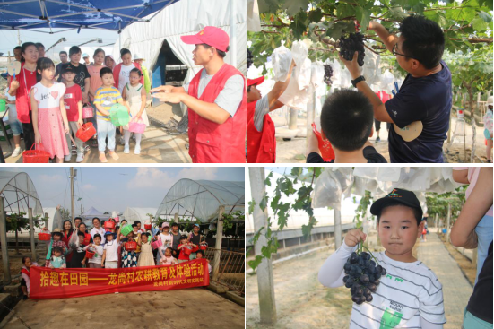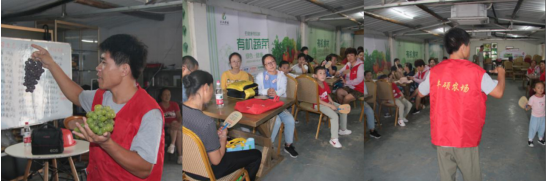 活動伊始,農(nóng)場技術(shù)人員為親子家庭講解葡萄的品種、類型、味道、品質(zhì),種植技術(shù)、怎樣管理和挑選等知識,使得參加活動的親子家庭對葡萄產(chǎn)業(yè)的產(chǎn)、供、銷等有了更深的了解。隨后,在農(nóng)場技術(shù)人員帶領(lǐng)下,大家拎著籃子,拿著剪刀,穿過葡萄架下的小道,直奔葡萄園。八月正是葡萄成熟的季節(jié),走進(jìn)葡萄園中,已是一副“蒼藤蔓,架覆前檐,滿綴明珠絡(luò)索園”的美麗景象。聽完技術(shù)人員對土壤的物質(zhì)循環(huán)介紹和采摘過程中的技巧及注意事項后,大家便迫不及待地體驗(yàn)采摘快樂,每人都盡情呼吸著田園的氣息,暢享著大自然賜予的豐碩成果。