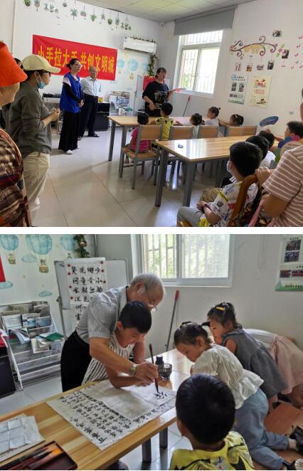 隨后,鐘老師帶著和藹的笑容拿出筆、墨、紙、硯等活動工具,展示了一張“百善孝為先”的書法作品激發(fā)孩子們的興趣,科普書法知識。學習中,鐘老先生選取了幾首耳熟能詳?shù)墓旁娫~,讓孩子們圍坐在桌邊,現(xiàn)場指導書法技巧。最后,經(jīng)過“能人”鐘老先生和孩子們共同的努力,一首《回鄉(xiāng)偶書》書法作品引得現(xiàn)場的家長們連連稱贊。
