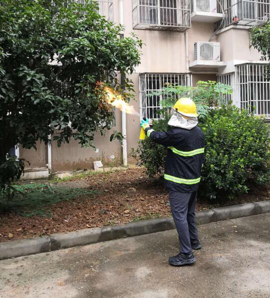 只見,文康苑社區(qū)工作人員利用打火機,點燃了樹上的馬蜂窩,只見馬蜂窩的殘渣一塊一塊的往下掉,隨后穿戴好防火面具的工作人員立即使用準備好的滅火器,對火源進行噴射,避免了火勢的進一步擴大,在解決安全隱患的同時,避免新的安全隱患發(fā)生。