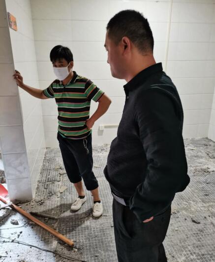 金陵驛社區(qū)負責人,帶領(lǐng)物業(yè)人員,來到金桂園商鋪東花崗浴室,就因裝修擾民問題,現(xiàn)場督促施工方要注意時間段管控。強調(diào)環(huán)境保護的重要性,并要求合理安排施工時間,做好施工材料擺放的全覆蓋工作。
