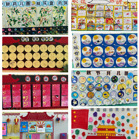 小班組的孩子們雖然剛?cè)雸@一個月左右,但是也通過自己的小手和畫筆做出了一幅幅生動美麗的作品,例如“繪畫天安門”“祖國媽媽生日快樂”“月兒圓”“桂花香”“五星紅旗”等等,也對中秋和國慶的習(xí)俗有了初步的了解。