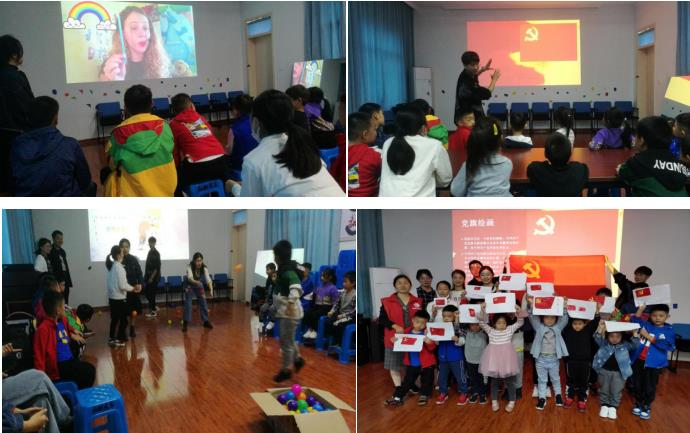 活動伊始,老師帶領(lǐng)孩子們認(rèn)識了黨旗以及黨旗的組成鐮刀、錘子的意義,在老師的指導(dǎo)下,孩子們靈活運用紙筆,紛紛畫出顏色鮮艷的黨旗。接著,運用視頻的形式從英語的視角引導(dǎo)孩子們用英語說出不同的顏色,不會英語的小朋友在重復(fù)學(xué)習(xí)2-3遍后,也都能用英語說出七彩的顏色;在此基礎(chǔ)上,又進行了顏色對對碰,2組小朋友一起出發(fā)把相應(yīng)顏色的貼紙拿回來貼到老師的身上;色彩炮彈游戲中,2組孩子上臺并排站,聽到老師用英文說的顏色后,把相應(yīng)顏色的炮彈投進老師用手比作的籃筐中,現(xiàn)場氣氛十分熱烈。