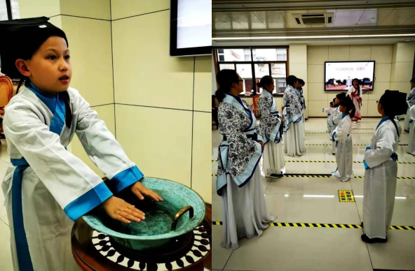 11月22日上午,東山社區(qū)居委會與睿心公益共同為東山社區(qū)的居民帶來了一場傳統(tǒng)和有著深遠意義的啟蒙禮儀式,通過穿漢服,習漢禮,讓孩子們感受中華傳統(tǒng)文化的光輝燦爛,在成長中表達對父母的感恩之情?;顒蝇F(xiàn)場,伴隨著優(yōu)雅古樸的樂聲,專家國學老師穿著漢服上臺,為即將進行啟蒙禮的孩子和陪同的家長們講解啟蒙禮的意義,并介紹漢服、學習揖禮。活動中,沃盥凈手是古人在做重要的事情之前,都要洗凈雙手,表示對事物的恭敬。沃盥之禮始于西周,因其繁瑣的儀式環(huán)節(jié)在戰(zhàn)國時期漸漸消失,今日復原沃盥之禮,去其繁瑣,存其精華,凈手靜心!