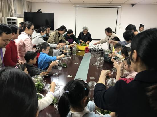 活動邀請了社區(qū)的腌菜高手李奶奶和季奶奶,他們手把手教著小朋友,先摘葉、再切根、再洗凈、再瀝干。接著小朋友和家長、黨員志愿者一起,在菜里撒上適量的鹽,小手和大手一起,攪拌揉搓加了鹽的菜,最后一起將菜裝入玻璃菜壇中。