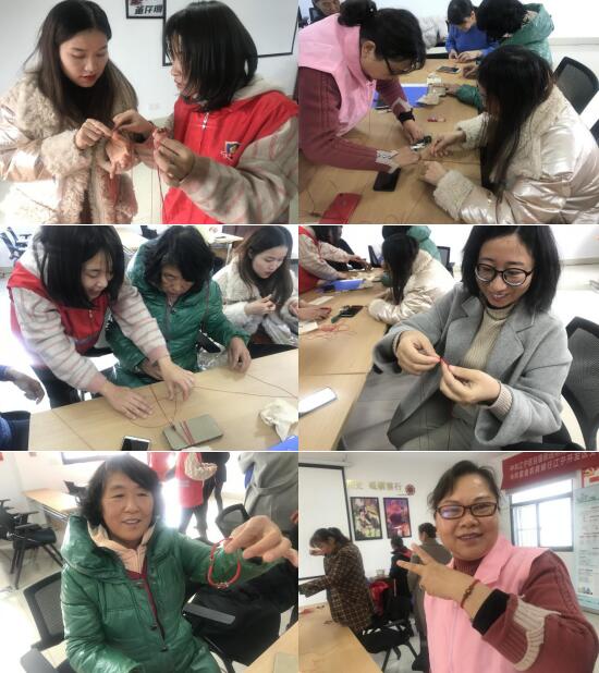 由于參與本次活動(dòng)的婦女大多數(shù)沒有編織的基礎(chǔ),為此,志愿者與授課老師商量,決定選擇容易上手的手繩編法開始,先易后難。然后志愿者將提前備好的材料分發(fā)給大家。志愿者老師一邊詳細(xì)講解編織方法一邊現(xiàn)場(chǎng)示范。盡管很多同志從未參與過此類編織、表示太難、看了幾遍還是不會(huì),但大伙熱情高漲,積極與身邊的人交流、分享,并積極向老師提問,了解編法。