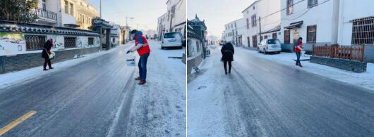 夜幕已經(jīng)降臨,風(fēng)雪還在繼續(xù)。黨員、志愿者們充分發(fā)揮先鋒模范帶頭作用,拿起鐵鍬、鐵鏟,齊心協(xié)力進(jìn)行路面清掃工作。鮮艷醒目的黨旗飄揚(yáng),與潔白的路面交相輝映,成為一道亮麗的風(fēng)景線。直到天色露白,村內(nèi)道路終于恢復(fù)往日的整潔順暢,確保了村民正常的出行秩序。同時,黨員、志愿者們還不忘在路面撒上工業(yè)鹽,以防道路再次結(jié)冰。