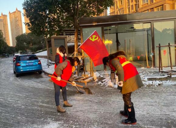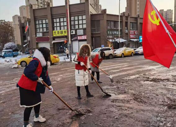 30日一早,天還未亮,社區(qū)工作人員又拿起了鐵鍬。黨旗下,大家不畏寒冷,熱情高漲,干勁十足,齊心協(xié)力清理著道路上的冰凍和積雪。晨光下,轄區(qū)干道、小區(qū)門口、校園大門逐漸通暢。