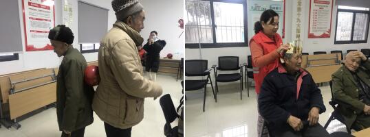 溫暖的祝福之后,隨即開(kāi)始熱身小游戲。志愿者把老人兩兩一組,背靠背放一只氣球,要求從起點(diǎn)到終點(diǎn)合作完成,目的鍛煉老人的身體靈活性和協(xié)調(diào)性,由于動(dòng)作簡(jiǎn)單又富有趣味性,老人們立刻互動(dòng)起來(lái),把活動(dòng)氣氛推向了高潮。