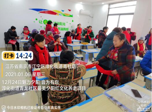 活動結束,社工給每位參加活動的老年人發(fā)放新年禮物——喜慶的大紅圍巾,老年人臉上洋溢著幸福的笑容,如同天邊那最美的夕陽紅。