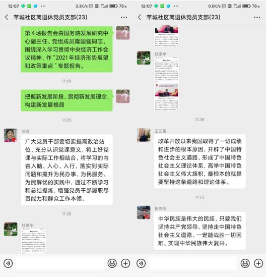 收看完畢后,部分離退休黨員在群里分享收看后的心得體會,表示作為一名退休共產(chǎn)黨員,雖然離開了各自崗位,但我們?nèi)詫⒗^續(xù)緊密團結(jié)在以習(xí)近平同志為核心的黨中央周圍,齊心協(xié)力、開拓進取,在社區(qū)建設(shè)工作中繼續(xù)發(fā)光發(fā)熱,以優(yōu)異成績迎接建黨100周年,為全面建設(shè)社會主義現(xiàn)代化國家、實現(xiàn)中華民族偉大復(fù)興的中國夢不懈奮斗。(戴天翠)
