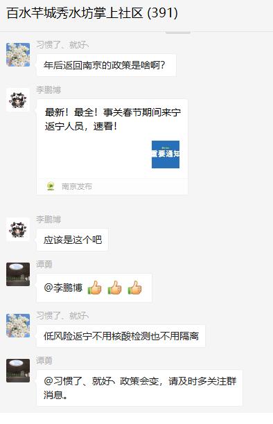 社區(qū)紅會每天向各微信群發(fā)布最新疫情風險等級提醒,幫助居民了解和掌握最新疫情發(fā)展情況,提醒居民目前疫情均得到有效控制,不必過分驚慌。并且,社區(qū)還不定期推送疫情防護知識及南京市民防疫十條,提高居民防疫防護知識,做到正確防疫,避免錯誤防疫保護方式的誤導。最后,社區(qū)微信群管理員展開實時監(jiān)督,對微信群內(nèi)出現(xiàn)的不實轉發(fā)信息進行及時辟謠,推送官方發(fā)布的消息,及時解答居民由于疫情產(chǎn)生的疑問。