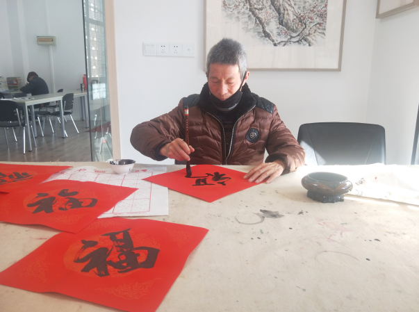 活動(dòng)中,石埠橋村社區(qū)殘疾人之家小灣書(shū)畫(huà)院的書(shū)法家和書(shū)法愛(ài)好者們?yōu)樯鐓^(qū)居民免費(fèi)創(chuàng)作春聯(lián)、寫(xiě)“福”字等。整個(gè)現(xiàn)場(chǎng)紙墨飄香,桌上、地上鋪滿了春聯(lián),氣氛格外熱鬧喜慶。“你們手寫(xiě)的春聯(lián),比印刷的更好看,年味更濃,更有福氣啊。”居民們一邊等著領(lǐng)春聯(lián),一邊感慨道。一下午,書(shū)法家們共為石埠橋社區(qū)居民們書(shū)寫(xiě)了近百幅春聯(lián)。