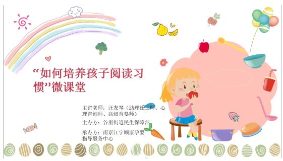 如何培養(yǎng)孩子的閱讀習(xí)慣?如何讓孩子愛上閱讀、喜歡閱讀?2月25日,南京市江寧區(qū)谷里街道民生保障部聯(lián)合南京江寧順康孕嬰指導(dǎo)服務(wù)中心開展以“如何培養(yǎng)孩子閱讀習(xí)慣”為主題的微課。