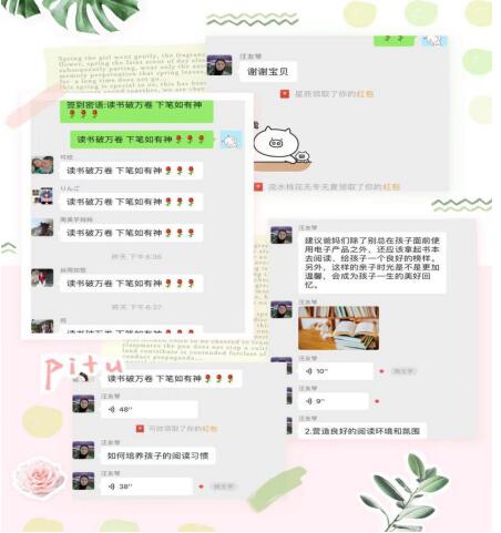 考慮疫情影響,本次活動采取通過語音、圖片、視頻、題目互動的形式。晚上19:00,隨著家長們陸續(xù)在微信群眾中打卡,本次微課堂正式開啟。課堂上,主講老師汪友琴緊緊圍繞宣講主題,以通俗易懂的語言和生動幽默的話語從六個方面著重介紹了培養(yǎng)孩子閱讀習(xí)慣的六大要點(diǎn),并以惠普爾增說過的話語論證養(yǎng)成讀書好習(xí)慣的重要性。現(xiàn)場,汪友琴還認(rèn)真解答孩子們及孩子的家長對于課程中不理解的地方,做到讓他們學(xué)有所思,學(xué)有所獲?;顒咏Y(jié)束后,家長們紛紛表示參加這樣的“微課堂”非常有意義,希望多多多開展這類活動,幫助他們更好的教育孩子。