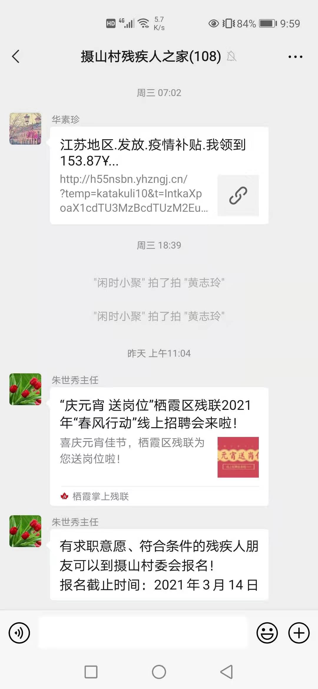 平日里,攝山村殘協(xié)對轄區(qū)內(nèi)的未就業(yè)殘疾人就業(yè)狀況進行日常調(diào)查摸底,確保較全面地掌握村內(nèi)殘疾人員的就業(yè)動向,利于日后幫扶工作的開展。開年以來,不少企業(yè)開展招聘,針對殘疾人提供眾多的就業(yè)崗位。村殘協(xié)充分利用信息化手段,創(chuàng)新就業(yè)服務(wù)形式,在村殘疾人之家微信群中推送線上招聘信息,讓殘疾人求職者足不出戶就可以了解招聘信息、投遞簡歷。