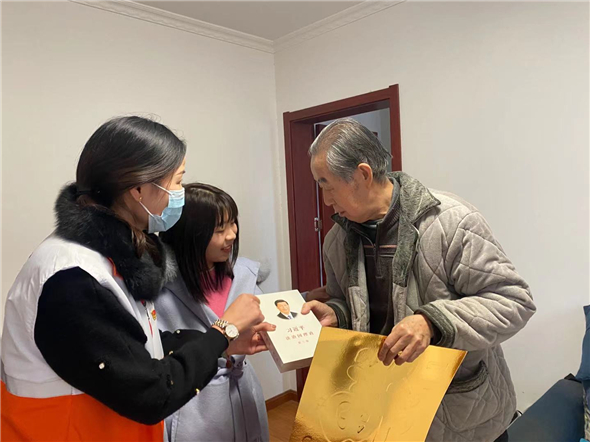 “今年的黨員冬訓(xùn)已經(jīng)開始了,這是支部為您準(zhǔn)備的學(xué)習(xí)資料。”黨員志愿者送上了新年掛歷、湯圓等節(jié)日禮物,“今天是元宵節(jié),特地為您準(zhǔn)備了一份我們剛包的湯圓,給您全家拜個(gè)晚年了。”“雖然我行動(dòng)不便,不能和大家一起上黨課,但是黨員冬訓(xùn)我還是不能落下的,也謝謝支部的節(jié)日祝福。”黨員賈定金說(shuō)道。