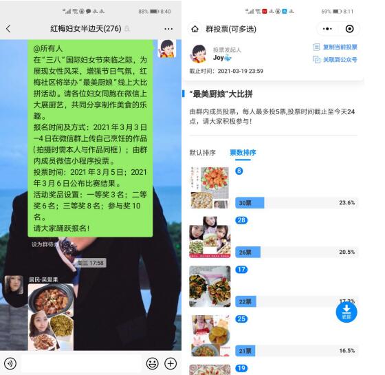 活動期間,紅梅社區(qū)充分利用微信群等線上交流溝通的陣地,開展“最美廚娘”大比拼,轄區(qū)婦女群眾踴躍報名,線下大展廚藝,線上積極分享,共同交流制作美食的經(jīng)驗。一張張圖片、一個個美食,讓默默在群里圍觀的看客們垂涎欲滴。