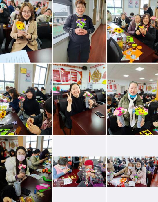 熱身游戲結(jié)束后,馮老師向大家介紹手工花卉制作的方法。大家拿到材料后迫不及待地動手制作起來,在志愿者及老師的指導(dǎo)下,女性朋友們表現(xiàn)出濃厚的興趣與激情,分別制作了花瓶、花瓣、綠葉等等,最后把它們粘貼在一起,做成了一朵朵漂亮的花。