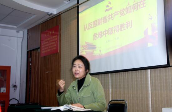 南京市秦淮區(qū)干部張靜同志在課堂講解“黨在戰(zhàn)爭年代中如何取得勝利”黨史