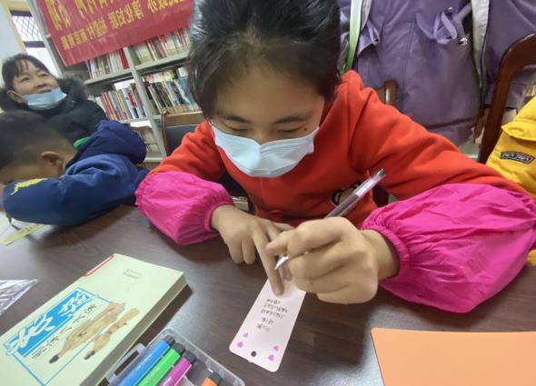 現(xiàn)場,為了激發(fā)青少年參與活動的積極性,還組織青少年們“DIY”書簽。裁剪紙條、勾勒框架,填充顏色......長長的紙條在青少年的創(chuàng)意繪制下組合成漂亮的書簽??粗约旱某善罚嗌倌陚兊哪樕下冻鰻N爛的笑容。