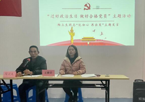 在一首大家耳熟能詳?shù)募t歌——《沒有共產(chǎn)黨就沒有新中國》中,活動拉開了序幕。過本月政治生日的黨員陶立生同志作了“憶初心 再出發(fā)”主題發(fā)言。他說:“作為一名共產(chǎn)黨員,我同大家一樣有兩個生日,一個是出生日,以示珍重生命;另一個是政治生日,表達(dá)對黨忠誠。政治生日活動,使我強(qiáng)化了黨性意識和宗旨意識,給了我接受黨性教育的絕好機(jī)會。作為一名共產(chǎn)黨員,我一定始終牢記黨的根本宗旨,心系群眾、服務(wù)人民。”
