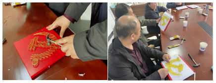 現(xiàn)場(chǎng),社區(qū)工作人員先為大家普及了釘子繞線畫(huà)的藝術(shù)起源知識(shí),之后引出今天的主題課程——運(yùn)用繞線藝術(shù)來(lái)制作富有立體感和藝術(shù)感的黨徽作品。工作人員說(shuō)道:今年是建黨100周年,小小的黨徽不僅代表了黨員的身份,更蘊(yùn)含了我們黨一百年波瀾壯闊的奮斗歷程,那段紅色的歲月和一個(gè)個(gè)紅色的傳奇,彰顯了中國(guó)人民從站起來(lái)到富起來(lái)、再到強(qiáng)起來(lái)的偉大飛躍歷程。現(xiàn)場(chǎng)黨員和群眾聽(tīng)了感受很深,迫不及待地投入到黨徽地制作中,有的拿起手上的小錘子敲敲打打,有的用線細(xì)心纏繞……通過(guò)不斷的摸索和實(shí)踐,既鍛煉了動(dòng)手、動(dòng)腦和實(shí)踐能力,又找到了制作的規(guī)律,最終由生疏變得得心應(yīng)手,黨徽也跟著熠熠生輝了起來(lái)。