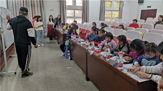 來自楓關(guān)愛服務(wù)中心的俞老師借助PPT和白板把需要動手制作的樹葉畫的主題和畫樣——“齊白石筆下的蝦”展示出來,先模仿蝦的形狀在白紙上畫出大概的輪廓,接著再用綠樹桿做蝦的腳,綠葉再用剪刀加工后修剪成蝦的身體,就可以加工成一幅“樹葉蝦”。