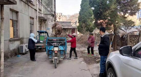 社區(qū)工作人員戴上手套,將散落在墻角、草叢、花壇內(nèi)的枯樹枝一一撿起。工作人員用繩子將體積較小的枯樹枝捆成一捆,體積較大的由兩個人共同搬運至車上。每項工作都有條不紊地進行著,大家面對這些堆積已久的枯樹枝干勁十足,有的人的額頭沁出了細(xì)密的汗珠,在太陽的照耀下閃著細(xì)微的光。在搬運的過程中還會掉落一些枯葉和灰塵,細(xì)心的工作人員在搬運完畢后還拿來了掃帚將現(xiàn)場清理干凈。
