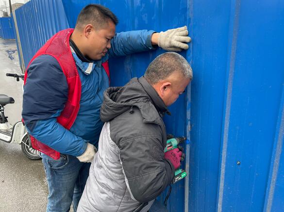 社區(qū)接到電話后第一時(shí)間組織社區(qū)工作人員帶上工具前往現(xiàn)場,發(fā)現(xiàn)部分圍擋出現(xiàn)被風(fēng)吹倒、傾斜、人為破損等現(xiàn)象,給出行的車輛和行人造成安全隱患。針對圍擋存在的問題,工作人員多措并舉,根據(jù)圍擋的類型、材質(zhì)、大小以及破損的程度等情況采取相應(yīng)的處理方法。一是利用鐵絲、扳手、老虎鉗等工具對輕微處進(jìn)行修補(bǔ),共修復(fù)5處。二是對嚴(yán)重破損的直接清除,并對圍擋加固,及時(shí)消除安全隱患,保障廣大居民的出行安全。