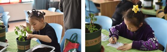 活動伊始,陳老師現(xiàn)場提問“人有五感有哪些”,強(qiáng)調(diào)親手種植的重要性。隨后,陳老師由勞動節(jié),引入到農(nóng)作種植勞動,并介紹本次種植需要的各種材料,并詳細(xì)講解農(nóng)作養(yǎng)植的注意事項(xiàng)。陳老師帶著小朋友和家長一同做熱身十字手指操,并分發(fā)材料給各位小朋友。種植開始后,小朋友們興趣高漲,與家人分工合作,放土、施肥、種苗、埋土,忙的不亦樂乎。“老師,我的土放好了,請給我肥料”、“媽媽,你看著,我去老師那領(lǐng)苗”,每位小朋友都全身心投入到農(nóng)作種植中,兩盆植株很快就栽種完成。