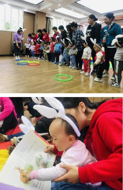 活動(dòng)開始,老師帶領(lǐng)孩子們跳《親子寶貝操》,訓(xùn)練寶寶走、跑、跳等基本動(dòng)作,培養(yǎng)寶寶的節(jié)奏感和集體意識(shí),消除緊張的情緒。通過游戲和音樂的熱身引導(dǎo),小朋友們的注意力很快被吸引,認(rèn)識(shí)了兔子,了解了它的生活習(xí)性等。在讀繪本這個(gè)環(huán)節(jié),老師帶領(lǐng)家長和小朋友們一起共讀繪本,并運(yùn)用豐富的肢體語言,以增加故事的趣味性,孩子們聚精會(huì)神。隨后,在老師的引導(dǎo)下,寶寶們自己動(dòng)手制作小兔子,增強(qiáng)寶寶的動(dòng)手和協(xié)作能力。