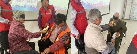 活動(dòng)開始前,志愿者講解趣味游戲賽前規(guī)則,本次趣味游戲參賽項(xiàng)目都是根據(jù)老人的年齡和身體情況來定,共設(shè)置了“盲人吃香蕉”和“趕豬進(jìn)欄”2項(xiàng)游戲。這些都是玩法簡單、道具便捷,娛樂性較強(qiáng)又無危險(xiǎn)、比較適合老年人的項(xiàng)目。志愿者早早就把游戲小禮品擺放好,等待老人的到來。老人們都很開心,很興奮,游戲還沒開始,看到地上擺放好的小禮品,各個(gè)都很積極想要熱身試玩,姿勢都擺放到位,開始準(zhǔn)備試玩。現(xiàn)場活動(dòng)氣氛融洽熱烈。老人都迫不及待的催著志愿者說,快點(diǎn)開始吧!